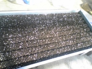 こんなふうに苗箱に泥を入れて、筋をつけてまきます。